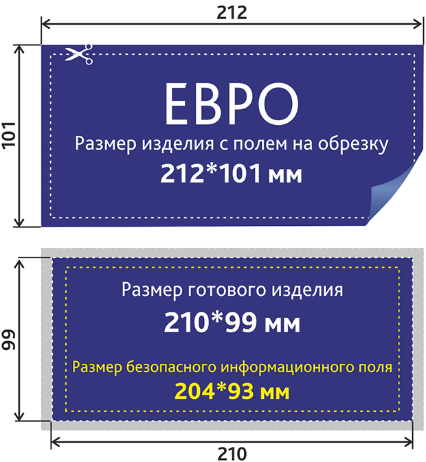 Размер евро с припусками на обрез 212x101 мм (т.е. по 1 мм с каждого края);