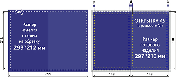 Размер открытки с припусками на обрез 299x212 мм (т.е. по 1 мм с каждого края);