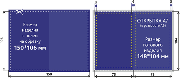 Размер открытки с припусками на обрез 150x106 мм (т.е. по 1 мм с каждого края);
